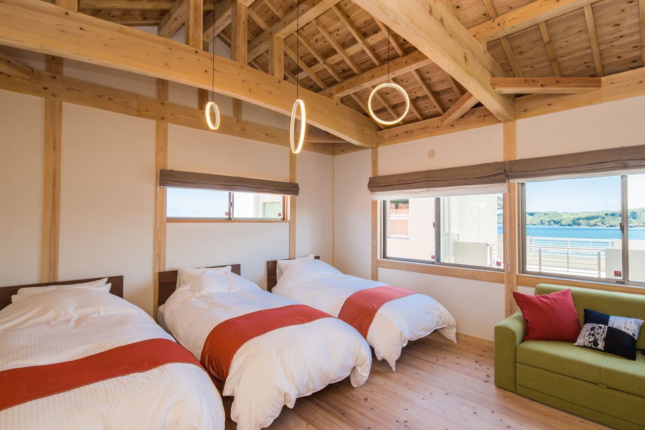中部エリアうるま市の端にちょっと足を伸ばして、「伊計別邸 一燈」で贅沢ステイを楽しむのもおすすめです。こちらのお宿は、1日1組限定で泊まれるオシャレな貸別荘。赤瓦の琉球モダンな雰囲気で、ウッディーな温かみのあるインテリアが素敵です。ビーチまで徒歩1分という最高のロケーションで、ベッドルームからは伊計島の美しいオーシャンビューも楽しめます。